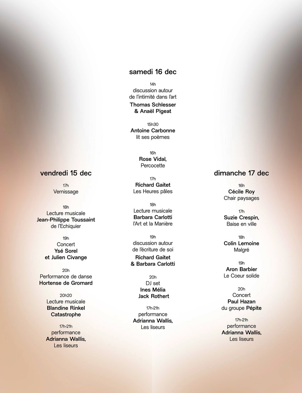 Je présenterai Entre les mailles, Les adresses et la performance Les liseurs, une longue lecture de lettres perdues qui se déroulera chaque soir.