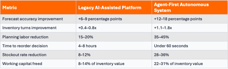 The companies that have deployed agent-first supply chain systems in production not pilots, not proofs of concept, but live autonomous execution are reporting results that the legacy platform vendors cannot match.