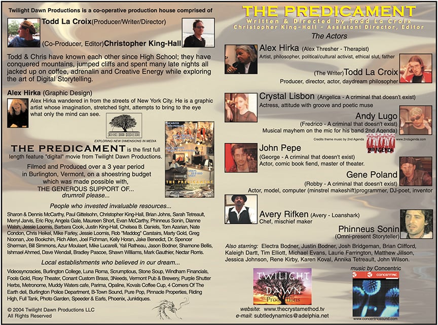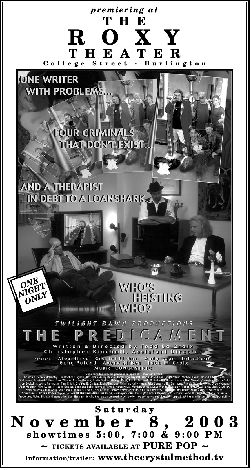In 2003 I was involved in a small independent film project called “The Predicament”. Filmed on location in Burlington, Vermont — it was directed by Todd La Croix