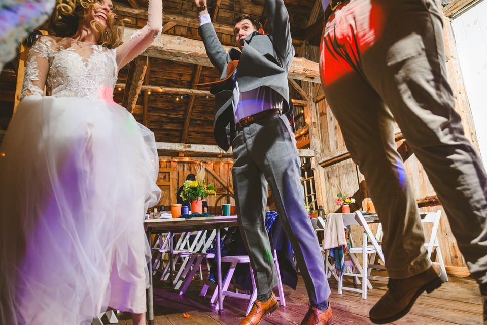 I used ambient light for most of the reception but by the time the dance floor opened up it was simply too dark so I had to set up lights. Most proper, non-barn venues have clean, white ceilings. Most rustic/outdoor weddings have a big white tent set up. In those cases I use an on-camera flash and bounce the light off the ceiling for a nice, even look. In a barn I typically can't do that because wood is dark and absorbs light. I will often times have to set up off-camera strobes. This barn was small so I couldn't set up lights on the floor without people knocking them over. This barn had a small loft in one corner. My genius solution to the lighting problem was to set up a powerful light on that loft, aimed down at the big white door you can see in the image above. This created harsh, directional light in one direction and soft, bounced light in the other direction. Here's what it looked like: