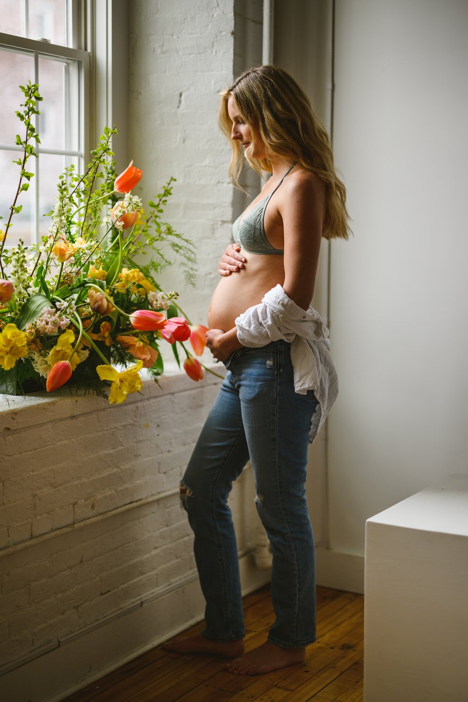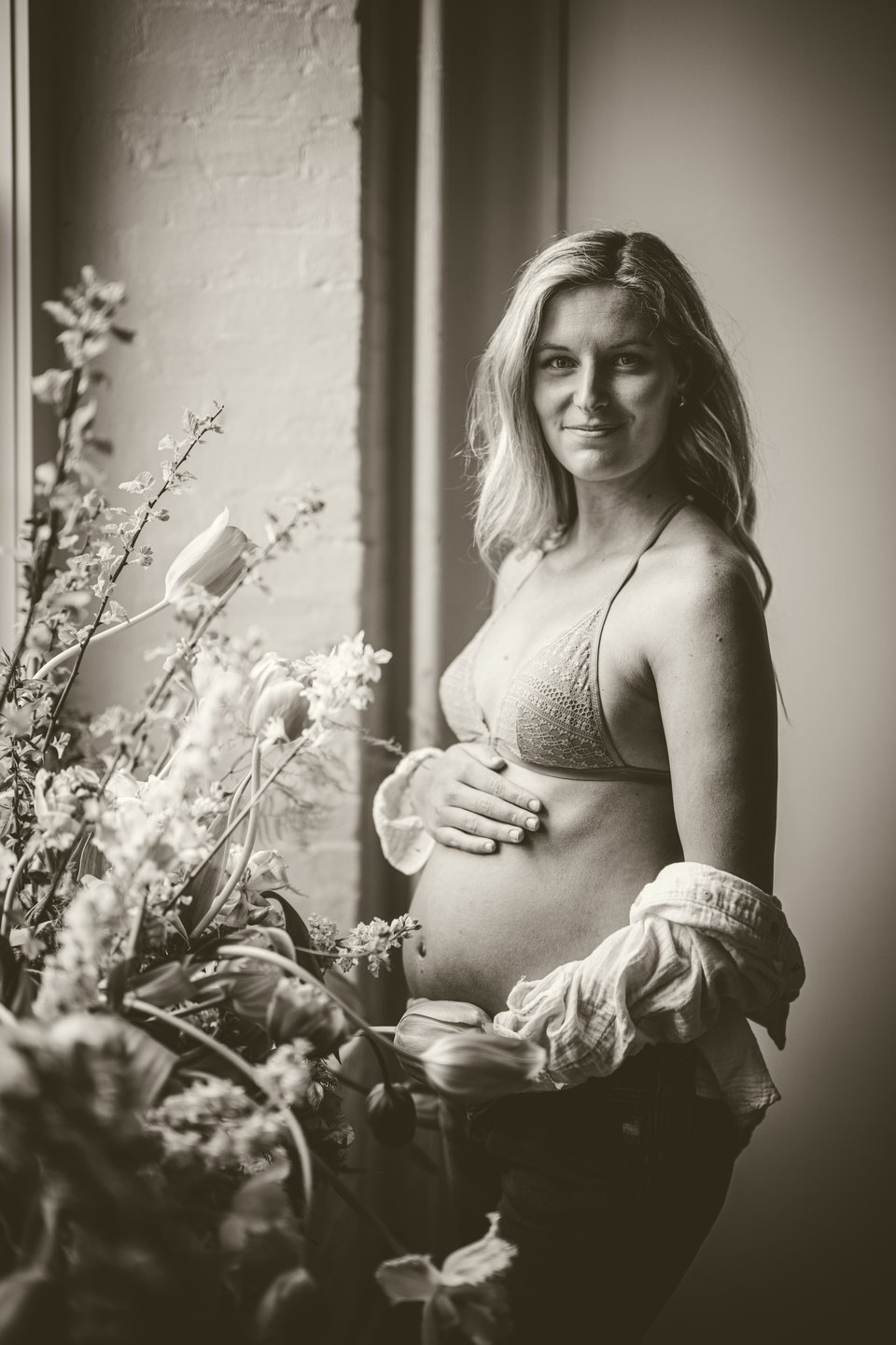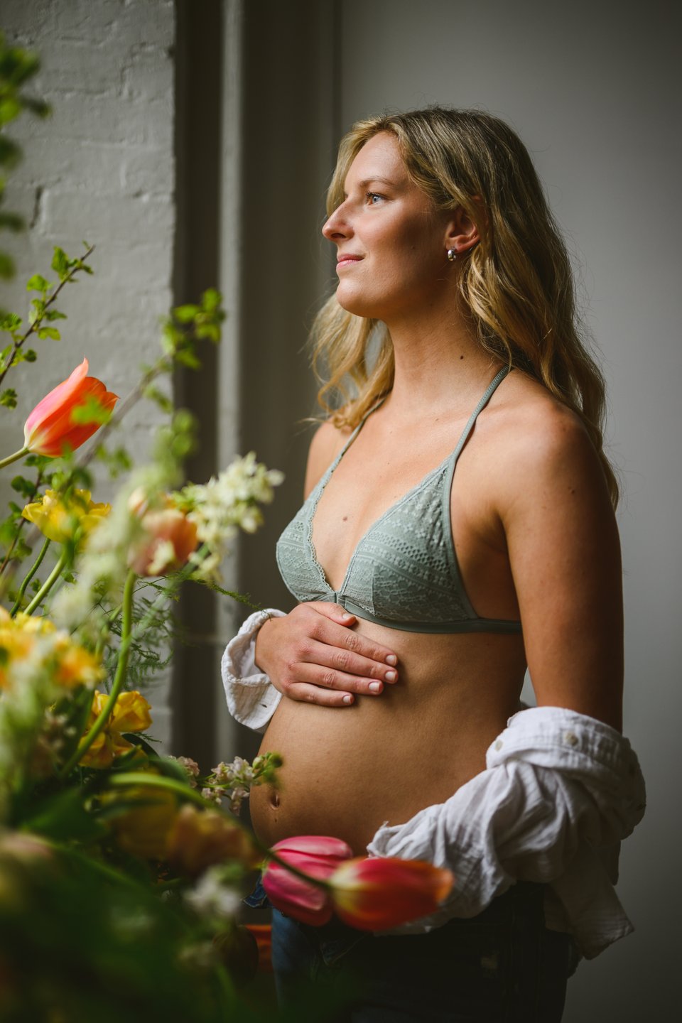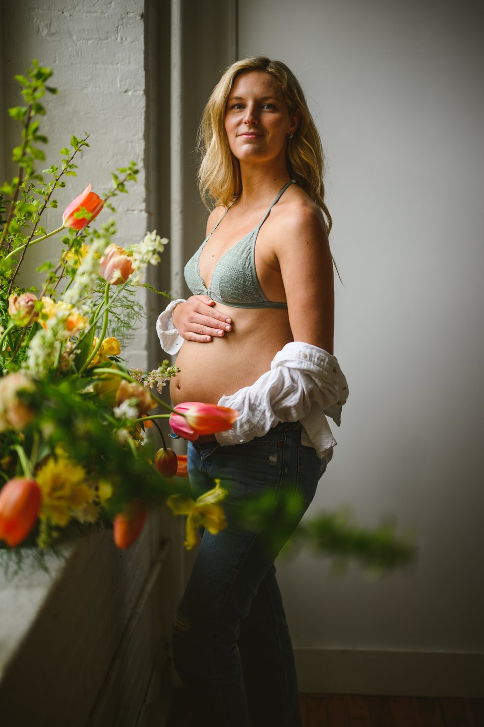 Next I headed over to the maternity model, a nice woman named Brooke who looked very peaceful hanging out next to some flowers. I felt confident that I nailed the first set up so I was comfortable being a little bit looser with this one. I just gave her the direction that she looked peaceful but strong and to do her best to convey that. I think it worked. I also wanted her figure to be partly covered by the flowers. I wanted there to be some connection to them without physically touching them.