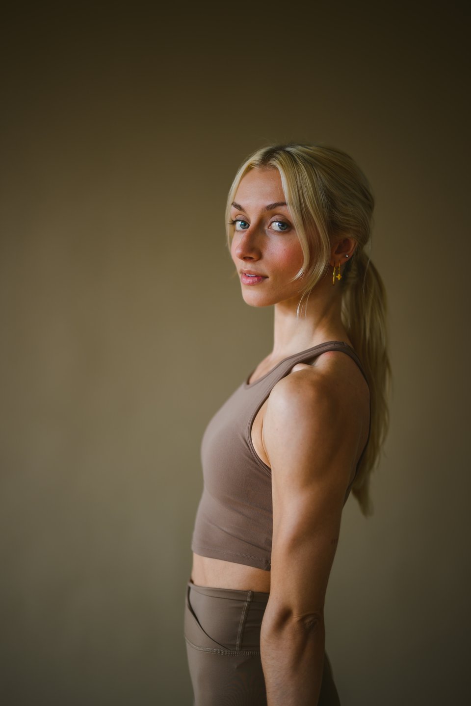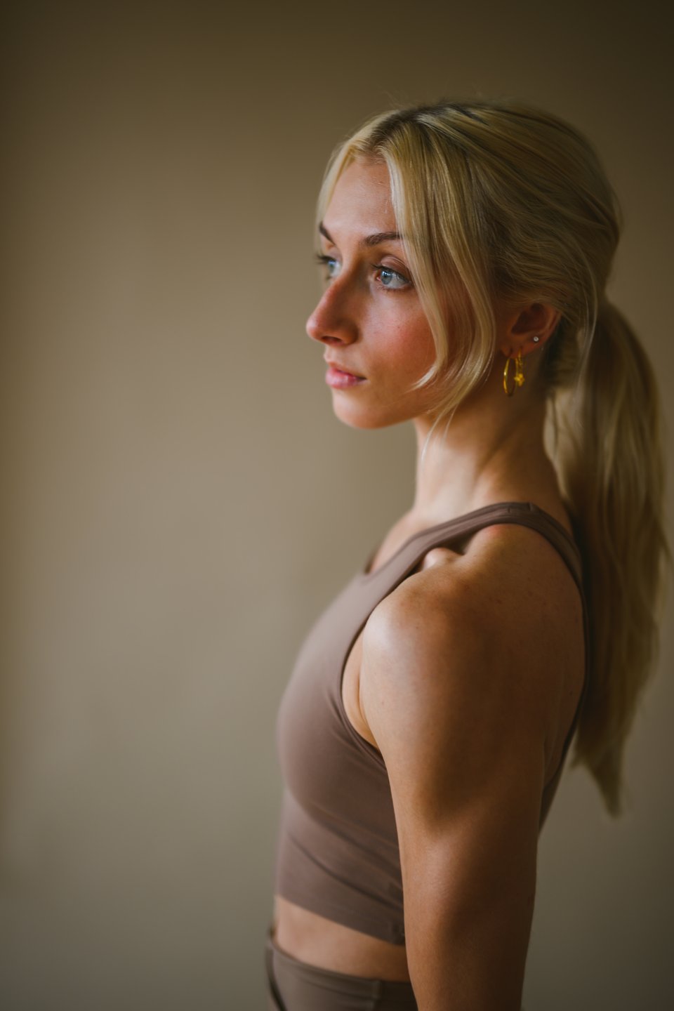 Then I headed over to the fitness model, also named Brooke. She is a personal trainer and my time with her was even quicker than with the other two. I wanted to go for form over concept and just wanted to subtly show off her muscles. I asked her to pick up one of the dumbbells she had and to hold it in her left hand. I explained that it would be out of frame and was there just to accent her arm muscle. I told her that the vibe I wanted was easy and confident strength. She nailed it with her interpretation of this. Her expression is great.