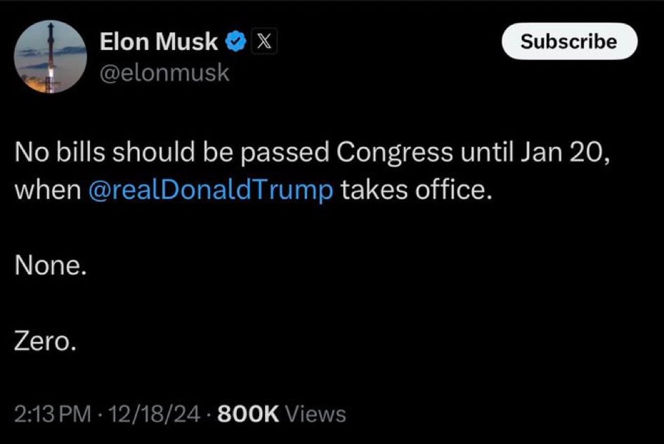 No, Musk is demanding — apparently successfully — that Republicans in Congress renege on a deal they had already agreed to, a continuing resolution that would keep the federal government going for the next few months. Why? Because, Musk says, of the outrageous provisions in that CR.