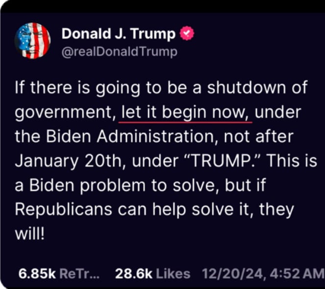 Goaded by Elon’s corrosive, lie-infused opposition to the bi-partisan House package, Trump came out against the bill and threw his party and Washington into total chaos. Trump undermined and weakened his own Speaker; had 38 Republicans vote against him and kill his first must pass bill even before becoming President (LOLOLOL!!!!!!); and has come off looking like a reckless buffoon who may not actually be running the show. (Hopium Chronicles)