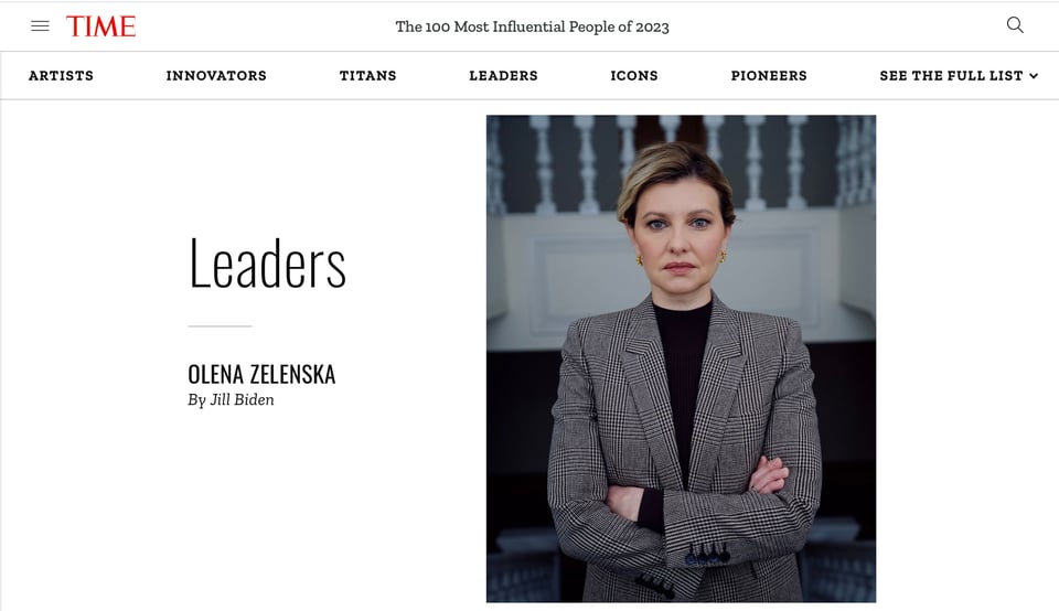 Each entry is explained by a few paragraphs by another notable person. (See sample in photo above.Olena Zelenska by Jill Biden👆).
