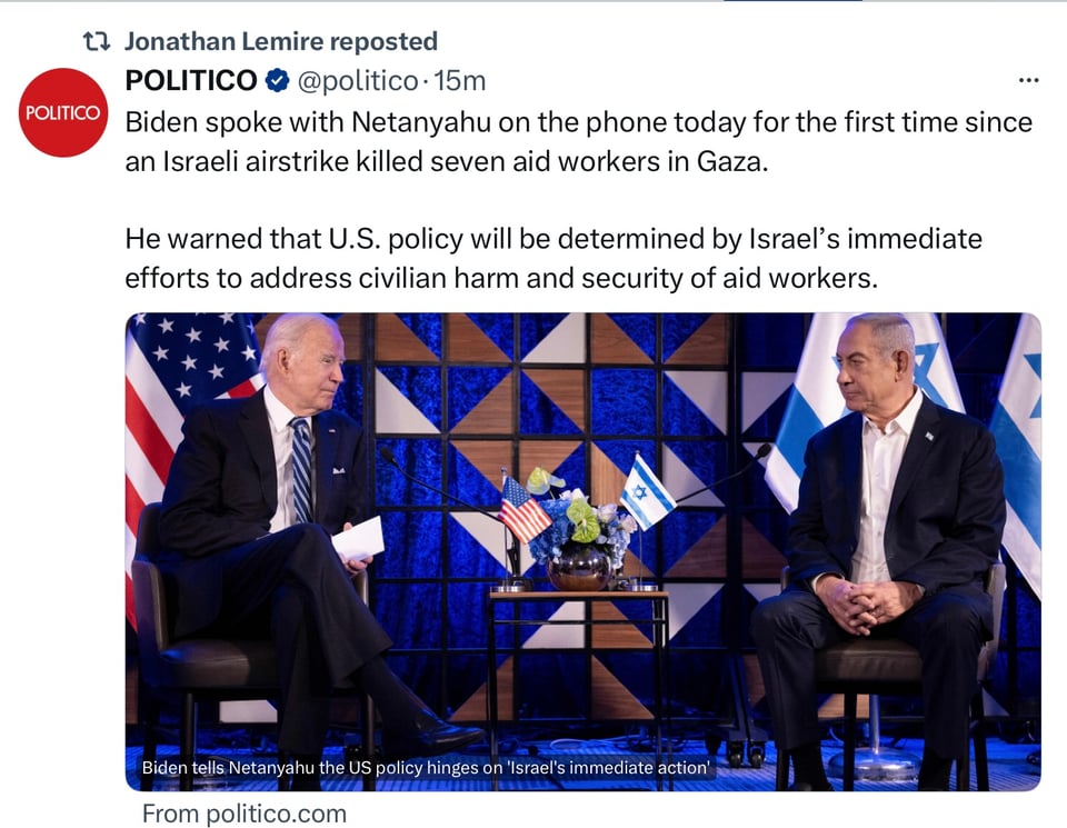 Driving the news: The call came three days after an Israeli strike killed seven World Central Kitchen aid workers, and with Biden under growing pressure from members of his own party to push for a ceasefire and ensure Israel does more to allow aid into Gaza.
