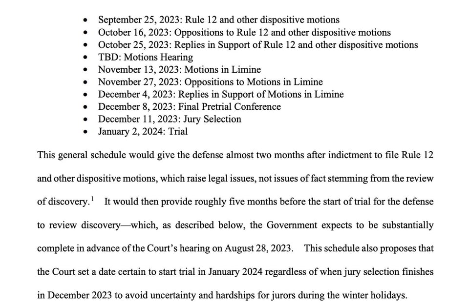 BREAKING: Jack Smith wants a Jan. 2, 2024 trial date for Trump on charges related to his bid to subvert the 2020 election. The prosecutors expect to produce almost all of the evidence by Aug. 28.