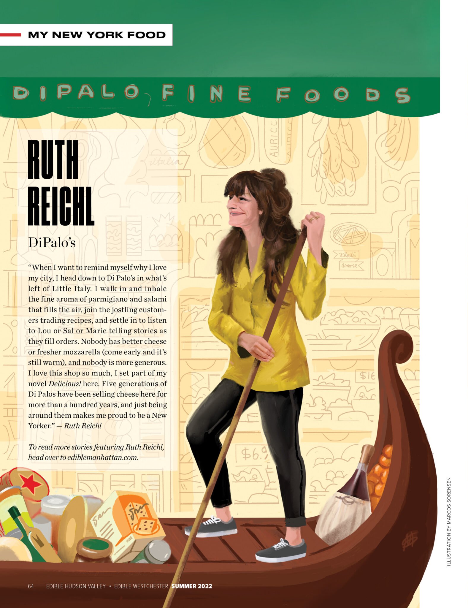 “When I want to remind myself why I love my city, I head down to Di Palo’s in what’s left of Little Italy. I walk in and inhale the fine aroma of parmigiano and salami that fills the air, join the jostling customers trading recipes, and settle in to listen to Lou or Sal or Marie telling stories as they fill orders. Nobody has better cheese or fresher mozzarella (come early and it’s still warm), and nobody is more generous. I love this shop so much, I set part of my novel Delicious! here. Five generations of Di Palos have been selling cheese here for more than a hundred years, and just being around them makes me proud to be a New Yorker.” — Ruth Reichl. (Edible, July 2022).