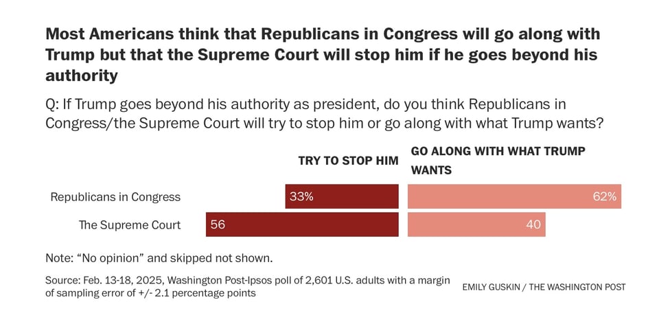 A majority of Americans believe the Supreme Court will try to stop Trump if he goes beyond his authority, but when asked whether Republicans in Congress will try to stop him if that happens, a majority say that Republican lawmakers are likely to go along with what Trump wants to do.
