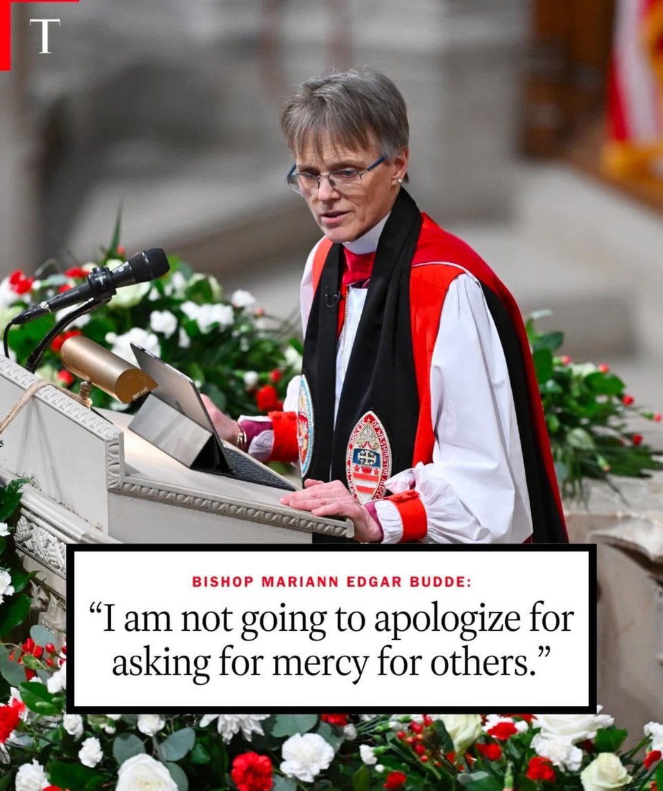 Trump got a well-deserved tongue-lashing earlier this week at the National Cathedral. Bishop Mariann Edgar Budde told him: “In the name of our God, I ask you to have mercy upon the people in our country who are scared now,” looking directly at the president. “There are gay, lesbian and transgender children in Democratic, Republican and independent families. Some who fear for their lives.” She continued,