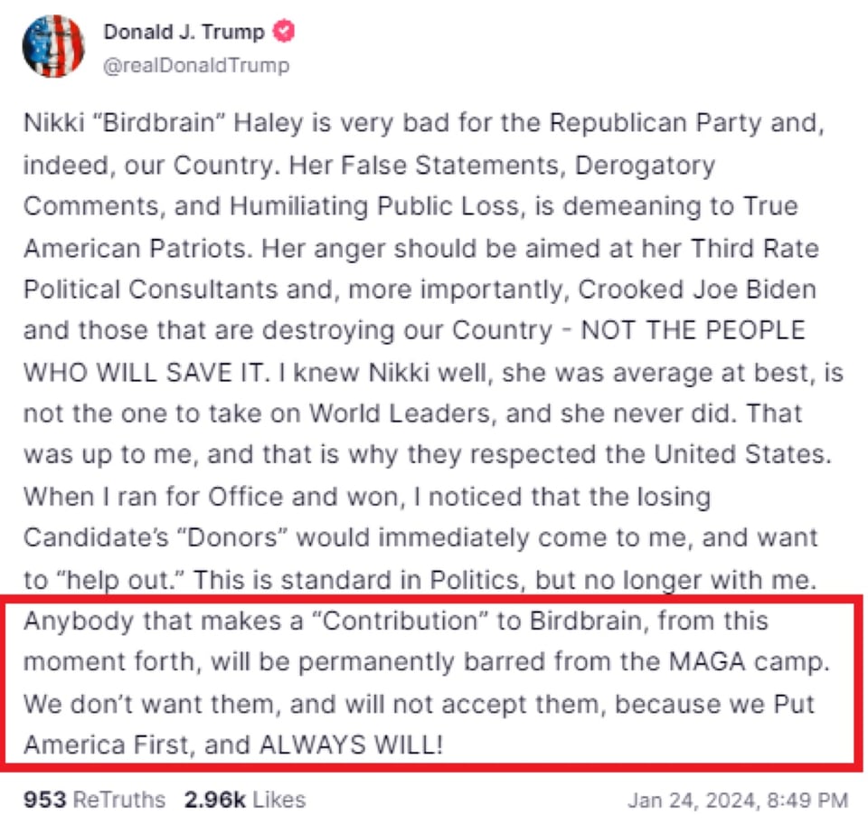 Mob boss delivers a message. Trump: Nikki Haley donors will be barred from "MAGA camp" - Axios via Bulwark