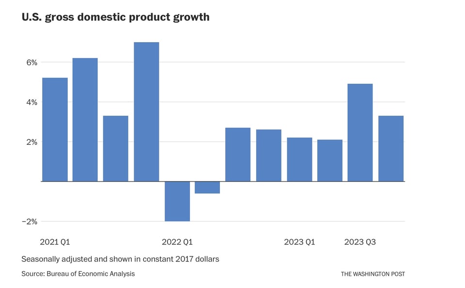 GDP grew even faster than many had anticipated in the last three months of the year — by an annual rate of 3.3 percent, according to the Bureau of Economic Analysis, offering fresh evidence that federal policymakers have managed to bring down inflation and secure a “soft landing” without major repercussions for workers or the economy.