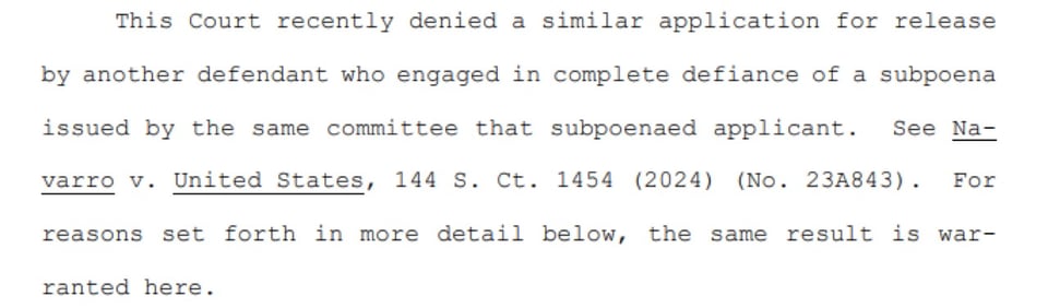 Solicitor General Elizabeth Prelogar wrote the court filing, referring to former Trump adviser Peter Navarro who is presently in federal prison. Navarro is also serving a 4 month sentence for Contempt of Congress for refusing to obey a subpoena from the January 6th Select Committee.