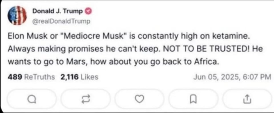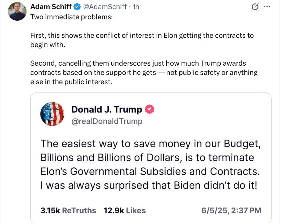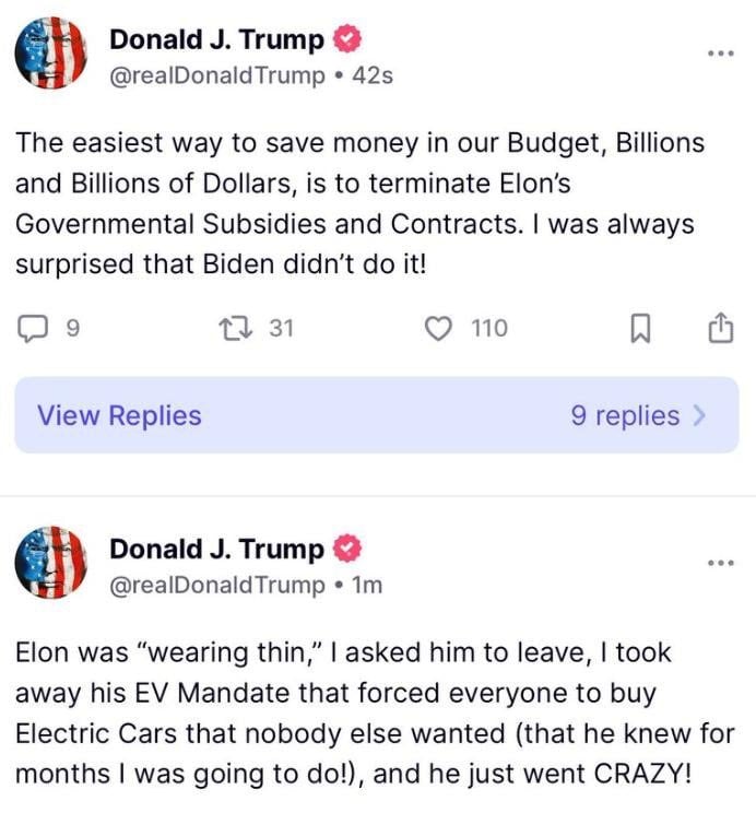 On Thursday afternoon, hours after he made his Oval Office remarks about Musk, Trump wrote on Truth Social that the billionaire “just went CRAZY” after he learned about the tax legislation’s provision ending tax credits for electric vehicles. In a separate post, Trump went further. “The easiest way to save money in our Budget, Billions and Billions of Dollars, is to terminate Elon’s Governmental Subsidies and Contracts,” he wrote.