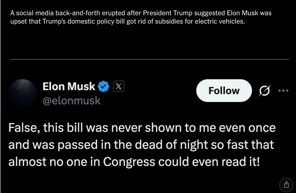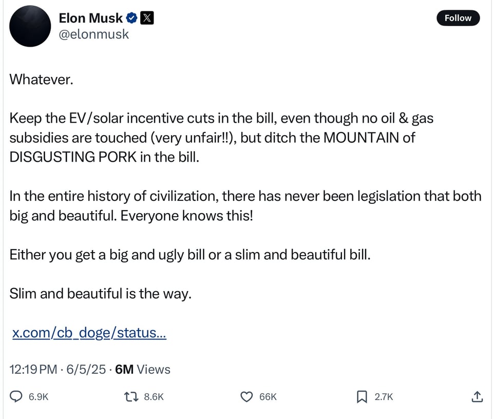 Musk also indicated he was fine with the electric-vehicle provisions in the legislation, even if he considered them unfairly singled out—as long as Republicans “ditch the MOUNTAIN of DISGUSTING PORK in the bill,” Musk wrote on X. He said the House bill was “never shown to me even once” and was “passed in the dead of night so fast that almost no one in Congress could even read it!”