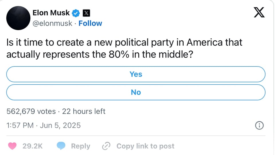 Later, Musk posted a poll on X asking his more than 200 million followers whether it was time to create a new political party that would better represent the majority of the country.