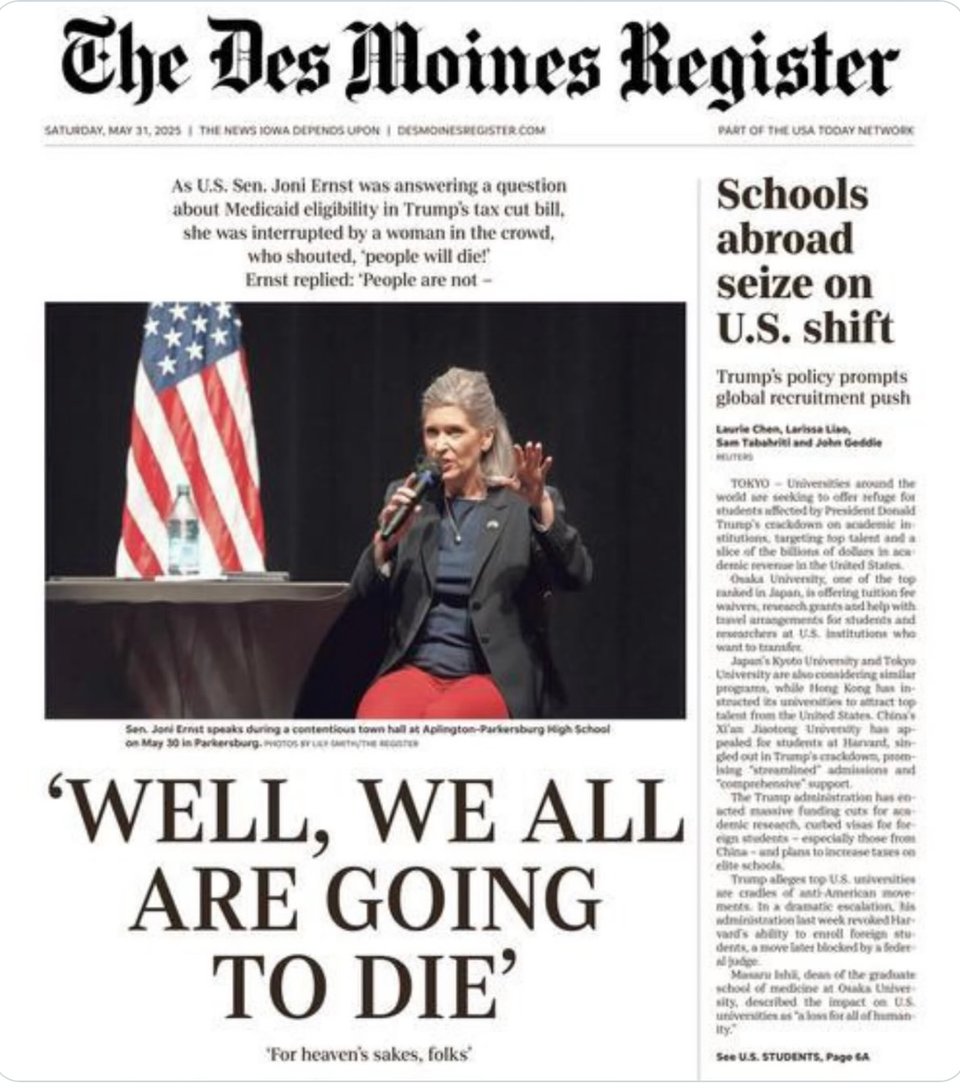 It was a distinctly Trumpian, never-say-sorry approach, though it didn’t seem to be helping her much politically. By Monday, the Des Moines Register had given most of their front page to her quote, a famous Iowa retailer was selling t-shirts mocking it, and a Democratic state representative had announced a bid to challenge Ernst in the 2026 midterms, saying the senator had been “disrespectful” to Iowans.