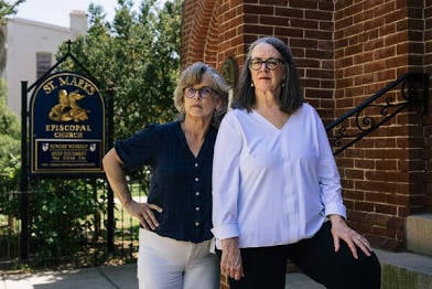 Julie Murphy, left, and Monica Mills have organized sessions at a church in Washington for parishioners to process their grief over how the Trump administration is changing their lives.