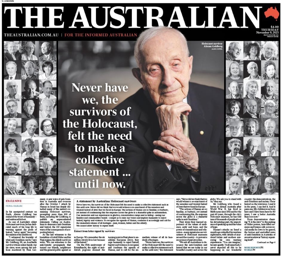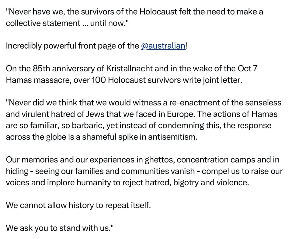 Australia. On the 85th anniversary of Kristallnacht and in the wake of the Oct 7 Hamas massacre, over 100 Holocaust survivors wrote a joint letter.