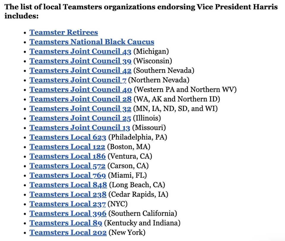 ” Separately, powerful local Teamsters unions in Philadelphia; New York City; Long Beach, Calif.; and Miami — as well as the union’s National Black Caucus and a group of retirees — have endorsed Harris and urged members to vote for her. “