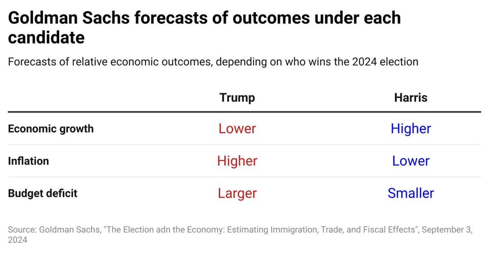 BREAKING: Goldman Sachs has predicted that under Kamala Harris, economic growth would be larger, inflation would be lower, and the budget deficit lower than under Donald Trump. This is a huge endorsement.