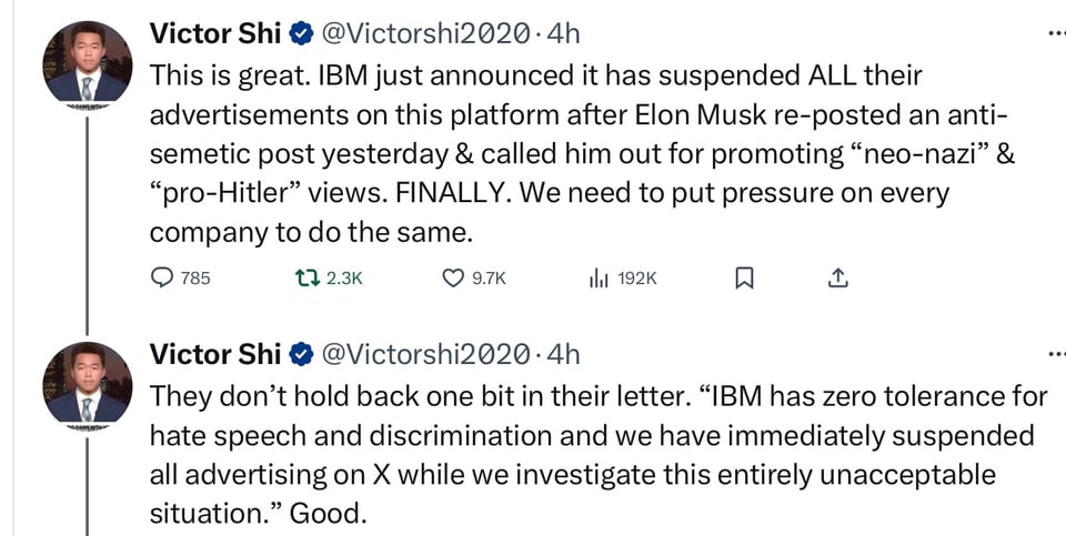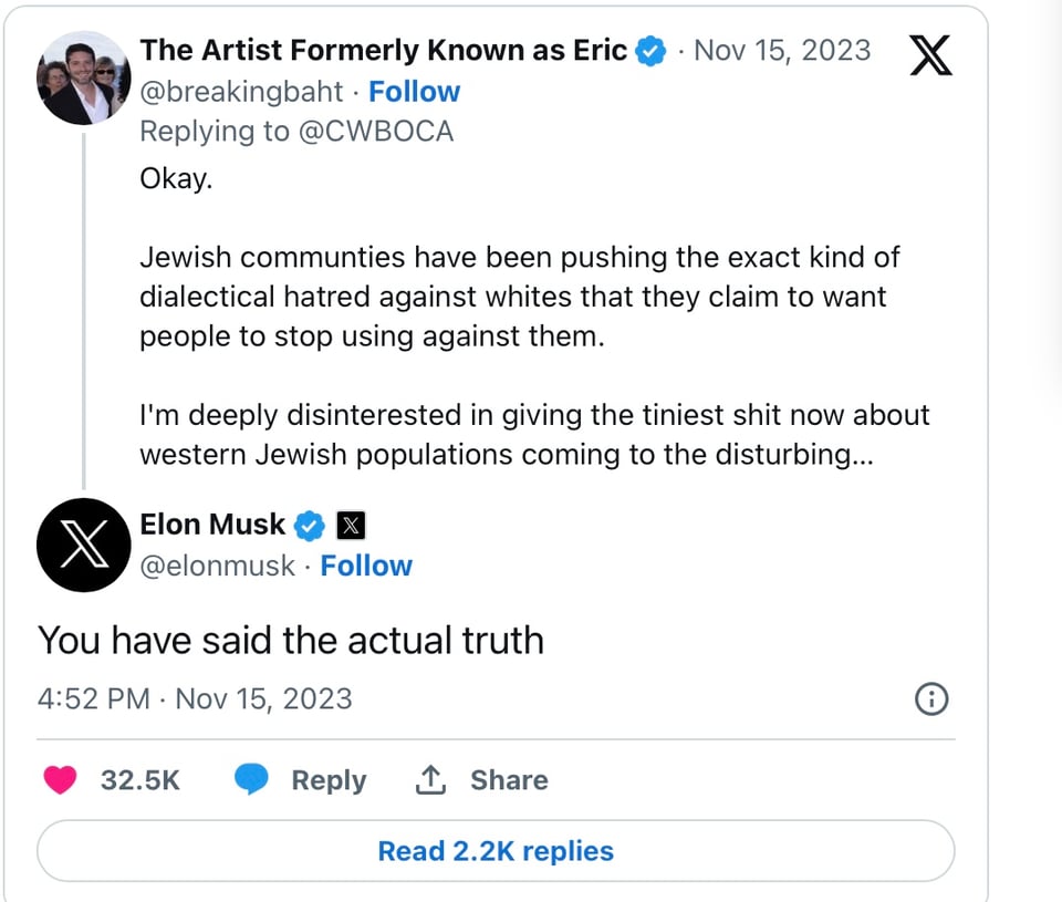 Musk responded, "You have said the actual truth" while also criticizing the Anti-Defamation League, an advocacy group that works to combat hate against Jewish people. "The ADL unjustly attacks the majority of the West, despite the majority of the West supporting the Jewish people and Israel. This is because they cannot, by their own tenets, criticize the minority groups who are their primary threat," Musk tweeted.