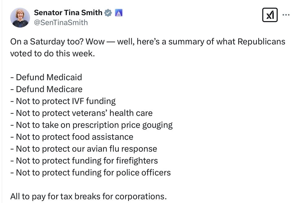 But others are becoming bolder. For example, bless Tina Smith, the retiring Senator from Minnesota. No holding back from her. Are you shocked? An outspoken Senator.
