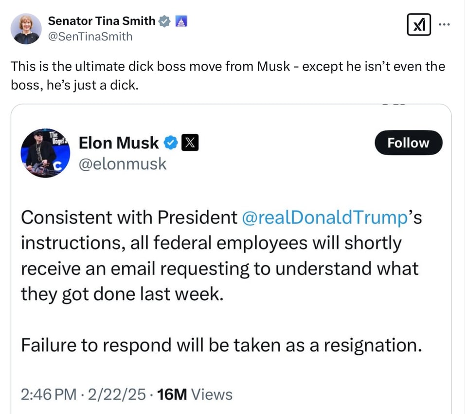 On Saturday, Trump urged Musk to be “more aggressive” in cutting the government, although the White House has told a court that Musk has no authority and is only a presidential advisor. “Will do, Mr. President,” Musk replied. He then posted a command to federal employees: “Consistent with [Trump’s] instructions, all federal employees will shortly receive an email requesting to understand what they got done last week. Failure to respond will be taken as a resignation.” Shortly after, emails went out giving workers 48 hours to list five things they had accomplished in the past week.