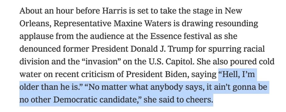 “People say Joe Biden’s too old. Hell, I’m older than Biden!” said the 85-year-old congresswoman. “It ain’t gonna be no other Democratic candidate, and we better know it.”
