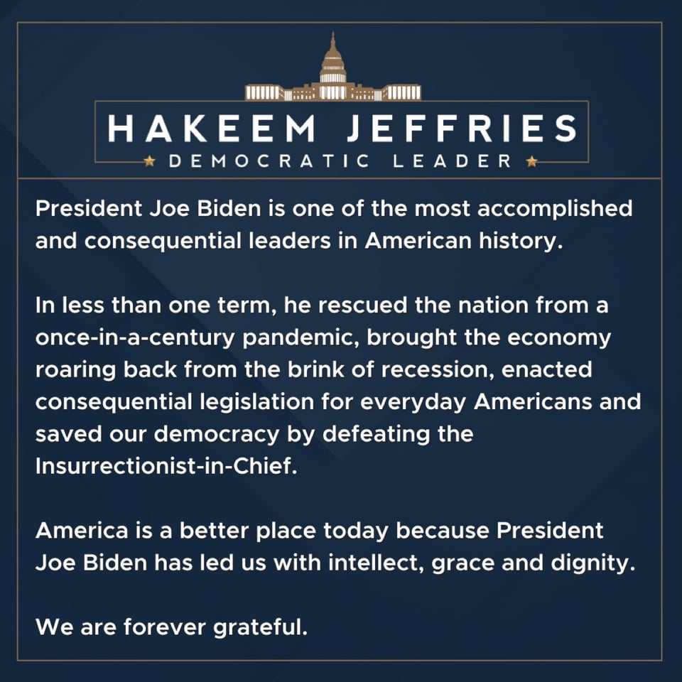 The framers of our Constitution knew that our republic would endure only if our presidents have the character and honor to put duty ahead of self interest. President Biden deserves our gratitude for his decades of service to our nation and for his courageous decision today.