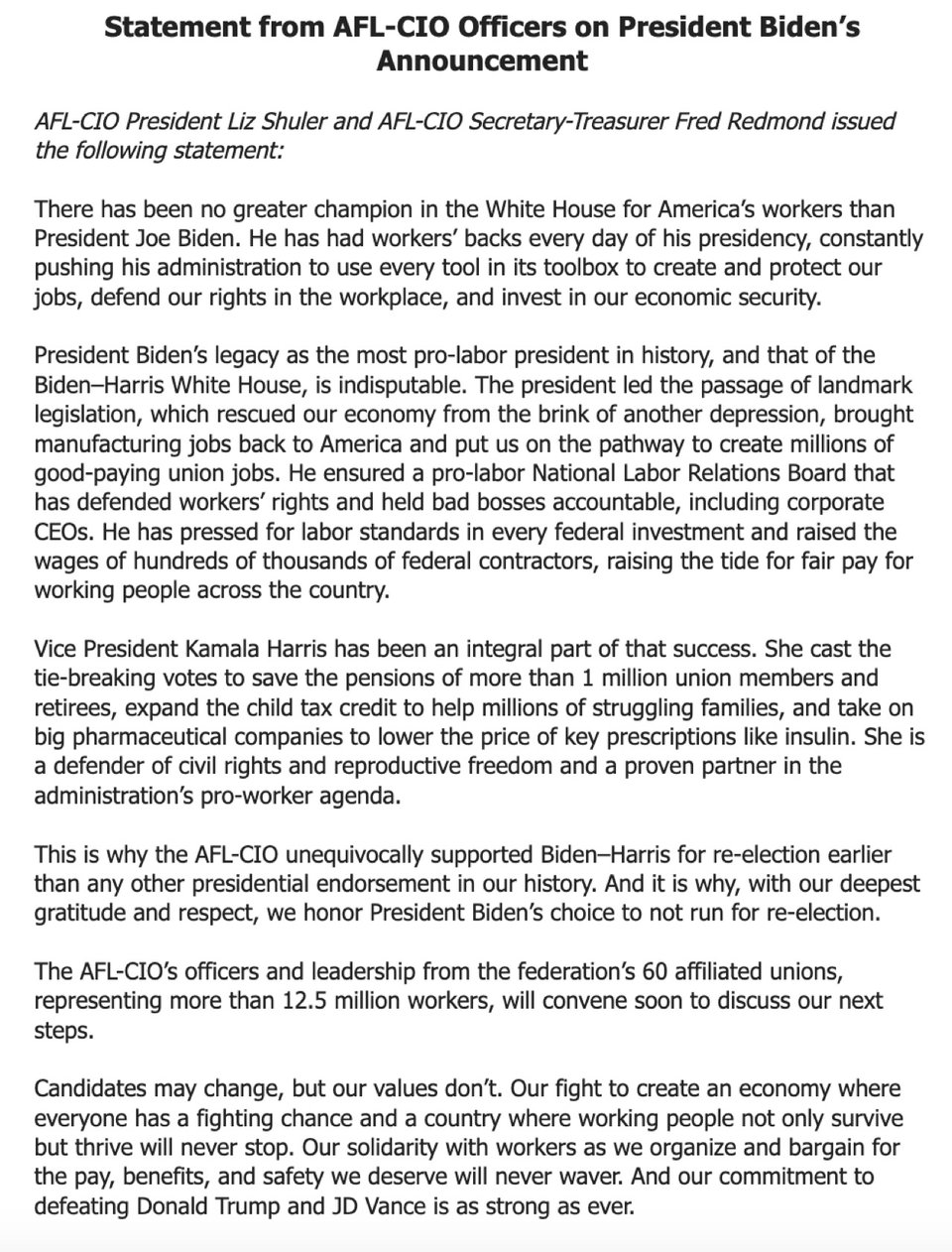 This outstanding track record gave President Biden every right to run for re-election and finish the job he started. Joe understands better than anyone the stakes in this election — how everything he has fought for throughout his life, and everything that the Democratic Party stands for, will be at risk if we allow Donald Trump back in the White House and give Republicans control of Congress.
