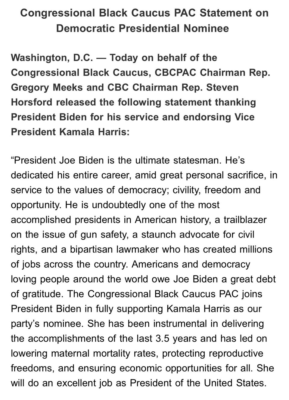 He has always acted for the good of our country and our Democracy. Yesterday he demonstrated great statesmanship and great courage in stepping down from his re-nomination and endorsing Vice President Harris.
