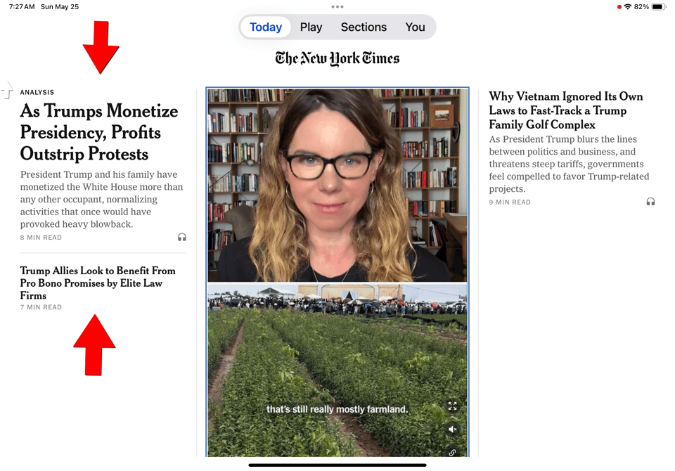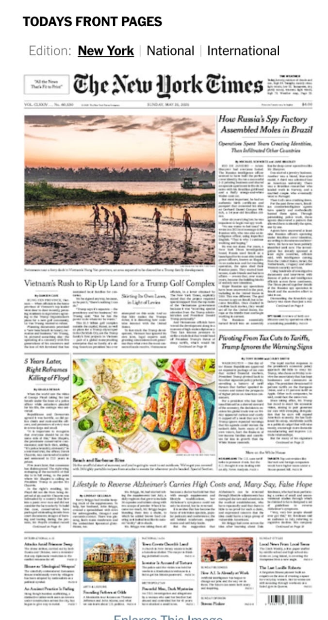 As seen, top article, front page, digital New York Times, Sunday, May 25, 2025. 👇