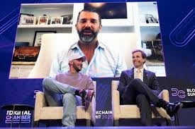 In this handout photo, Chase Herro and Zach Witkoff, co-founders of World Liberty Financial, and Donald Trump Jr., at a crypto event in Washington in March.Credit...The Digital Chamber, via Reuters
