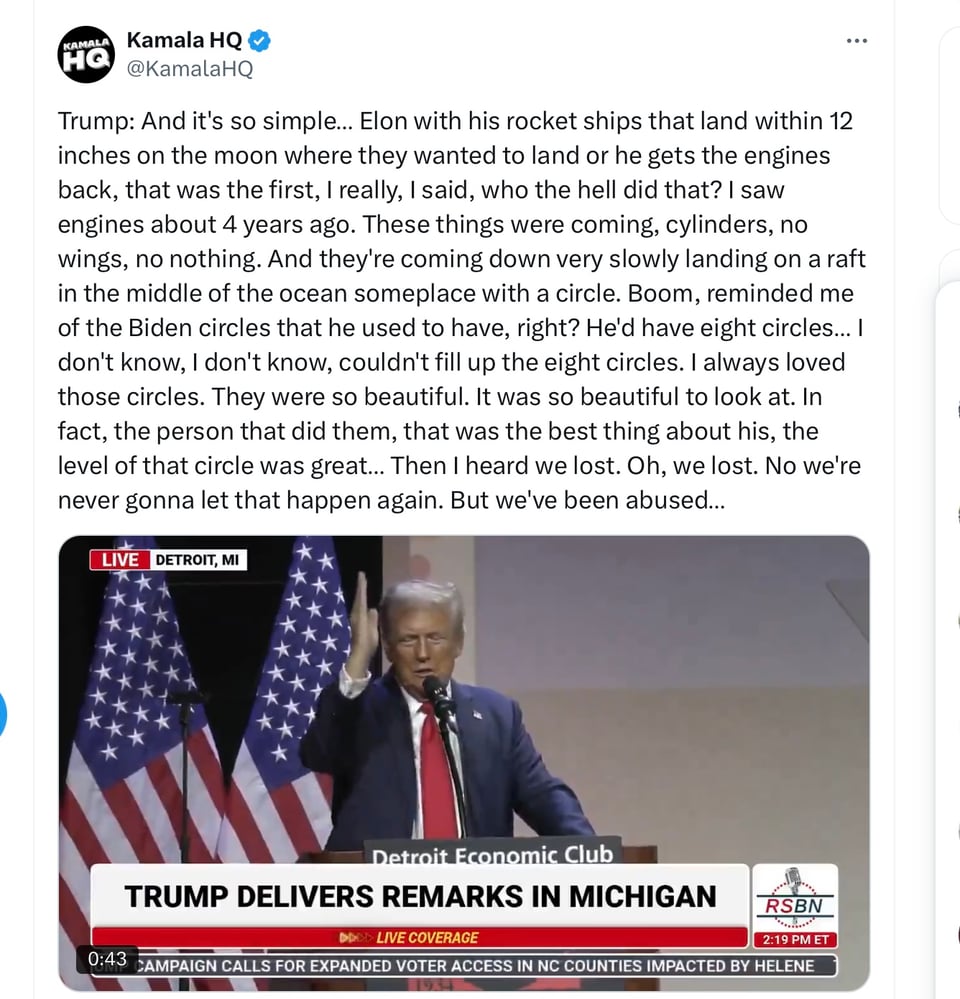 Trump: And it's so simple… Elon with his rocket ships that land within 12 inches on the moon where they wanted to land or he gets the engines back, that was the first, I really, I said, who the hell did that? I saw engines about 4 years ago. These things were coming, cylinders,… pic.twitter.com/M8g5oJ9Koy