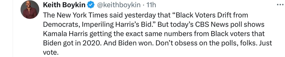 “There are more Black folks supporting Donald Trump than I thought,” he said, blaming what he called misinformation surrounding Harris’ background as a former prosecutor.