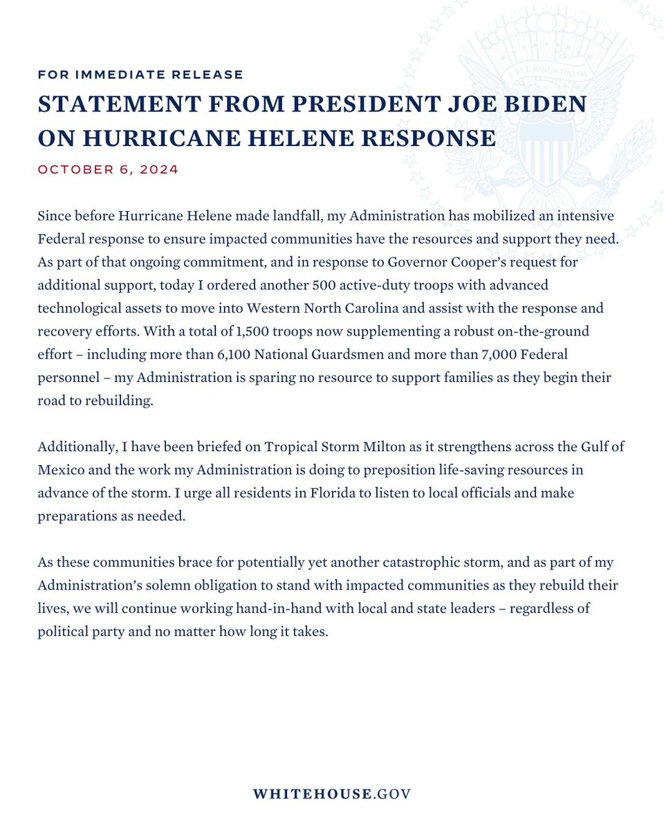 POLITICO’s E&E News reported this week that, as president, Trump could be “flagrantly partisan” in times of disaster and “on at least three occasions hesitated to give disaster aid to areas he considered politically hostile or ordered special treatment for pro-Trump states.” According to the report, Trump was hesitant to send disaster aid when California was ravaged by wildfires in 2018 until he learned the affected part of the state was saturated with Trump voters. Let’s be clear: Western North Carolina is not a political football. This is not a campaign opportunity. The most unhelpful thing any politician — or anyone else — can do right now is spread misinformation and tell people that their government isn’t doing anything to help them.
