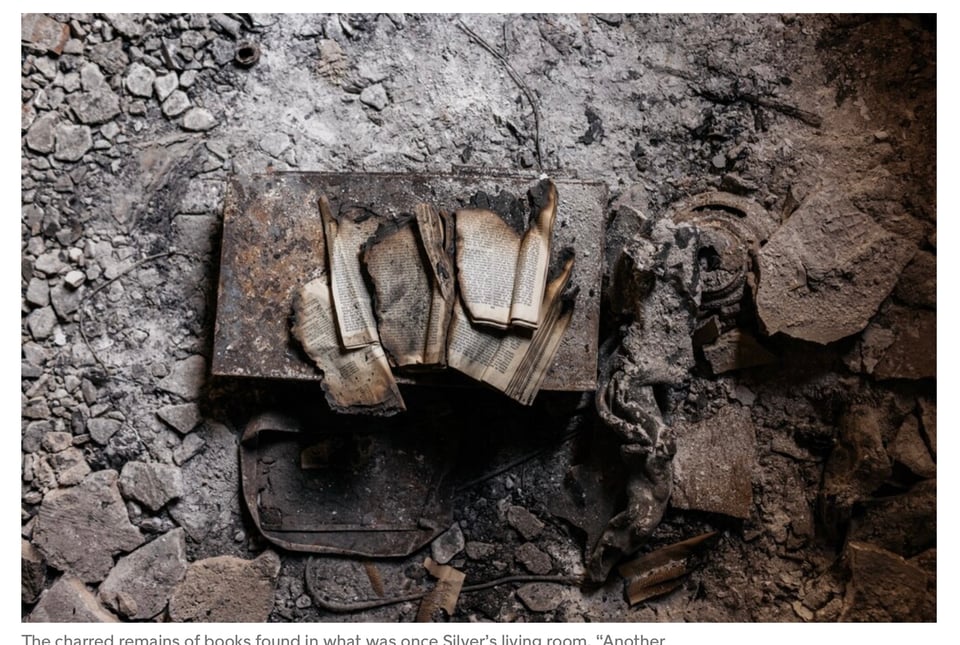 The charred remains of books found in what was once Silver’s living room. “Another person could come here and say this is the reason to kill Palestinians,” Yonatan said. “I stand here and say this is the reason to fight for peace.”Credit...Avishag Shaar-Yashuv for The New York Times.