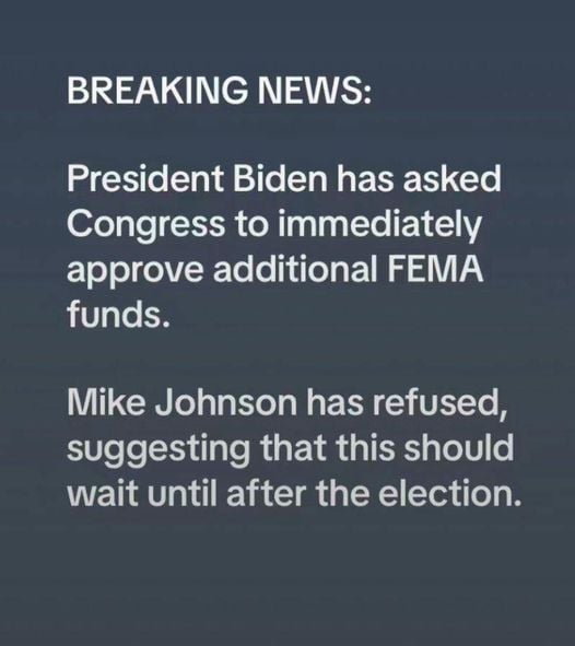Speaker Mike Johnson will NOT be calling the House back early to vote on a disaster aid supplemental in the wake of the Hurricane.