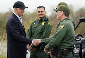 President Biden greets members of the U.S. Border Patrol at the U.S.-Mexico border in Brownsville, Tex., on Feb. 29.
