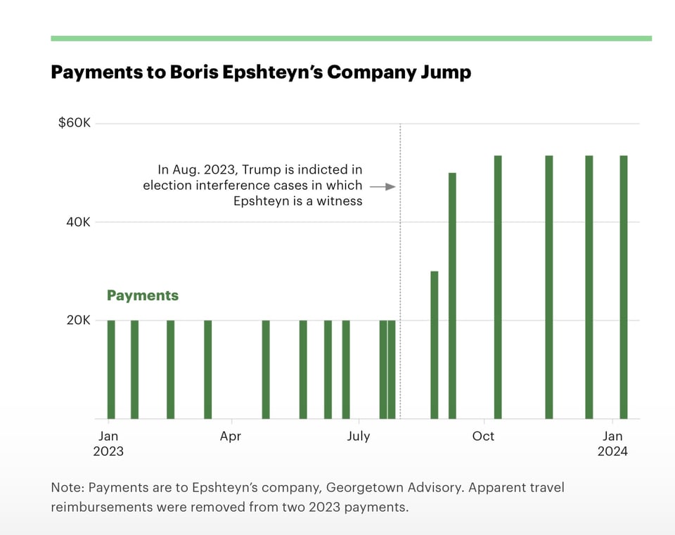Kenneth Notter, an attorney at MoloLamken who specializes in white-collar defense, said that a defendant should have a good explanation for a major increase in pay like Epshteyn’s. “Any change in treatment of a witness is something that gets my heart rate up as a lawyer.”