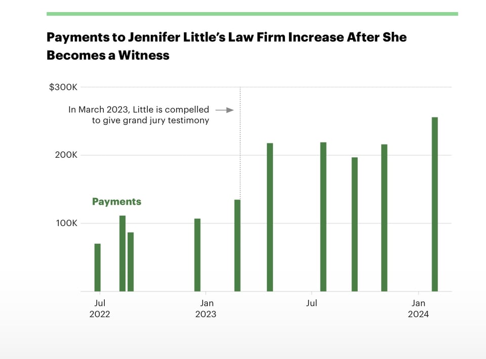 Just after Little was forced to testify before the grand jury in March 2023, a Trump political action committee paid her $218,000, by far the largest payment she’d received while working for Trump. In the year after she became a witness, she has made at least $1.3 million from the Trump political committee, more than twice as much as she had during the year prior.