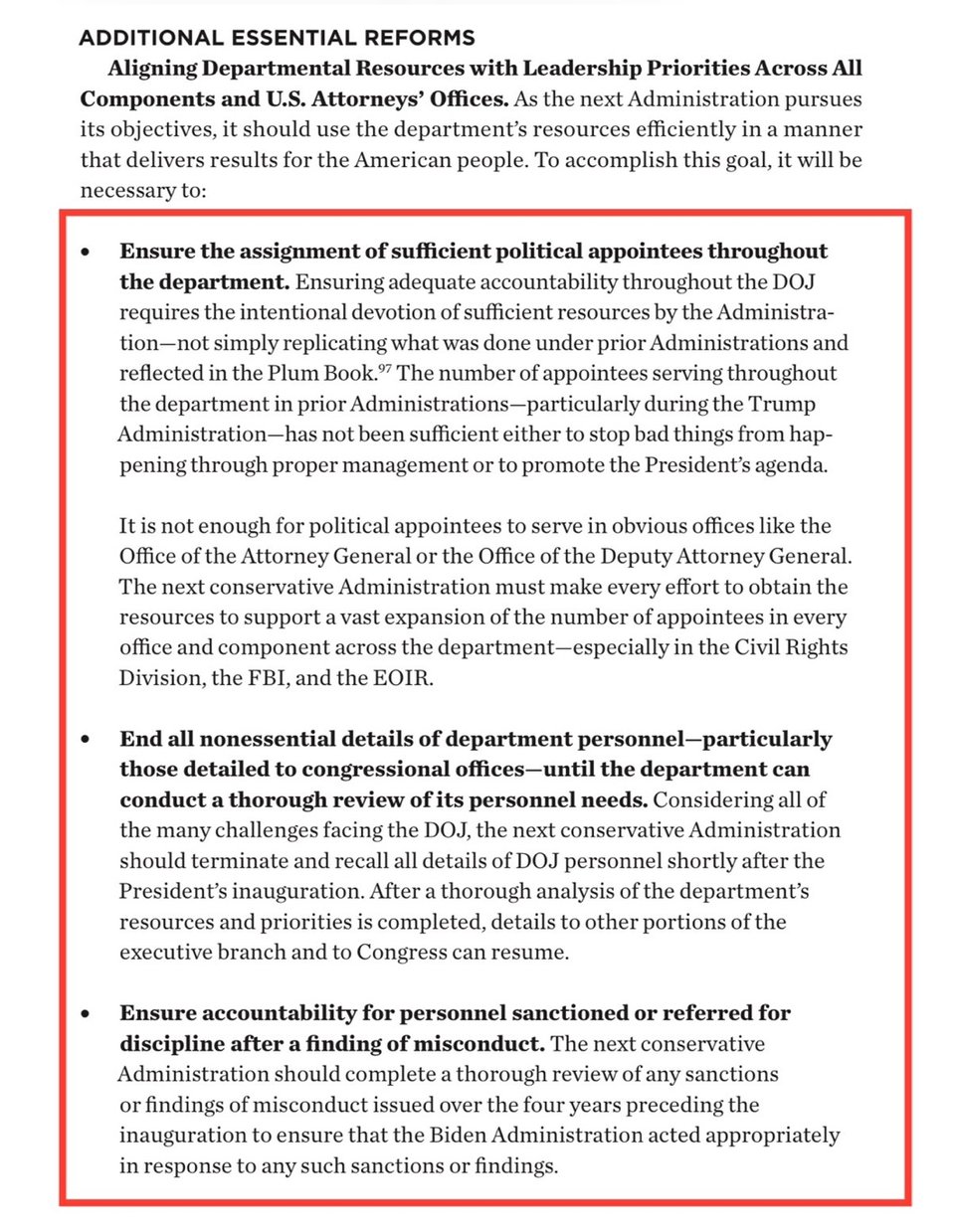 Trump’s goals aren’t “just” about the military. Project 2025 proposes to replace DOJ staff with staff who are “in line with Presidential Priorities.”
