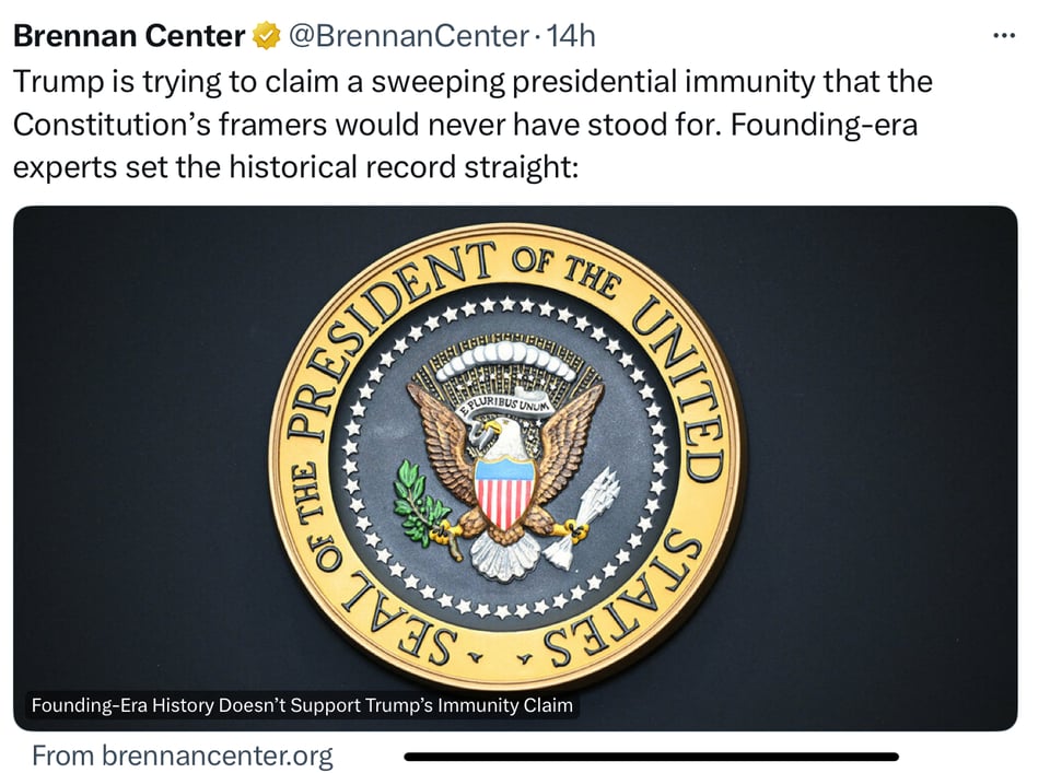 Here is an article from the Brennan Center, offering a discussion on Presidential immunity as claimed by Trump.