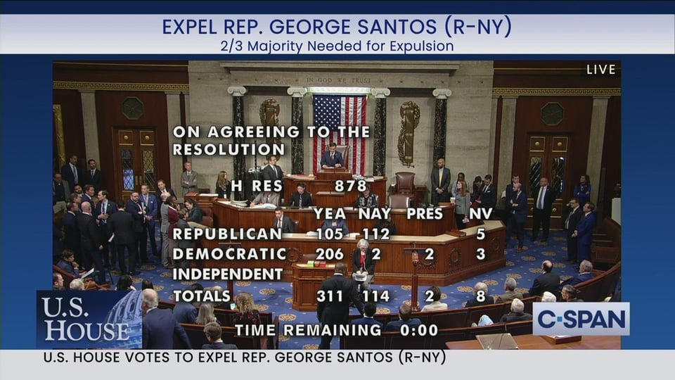 The House of Representatives voted 311-114 to expel New York Republican George Santos, making him the sixth House member to ever be expelled in a vote of Congress.