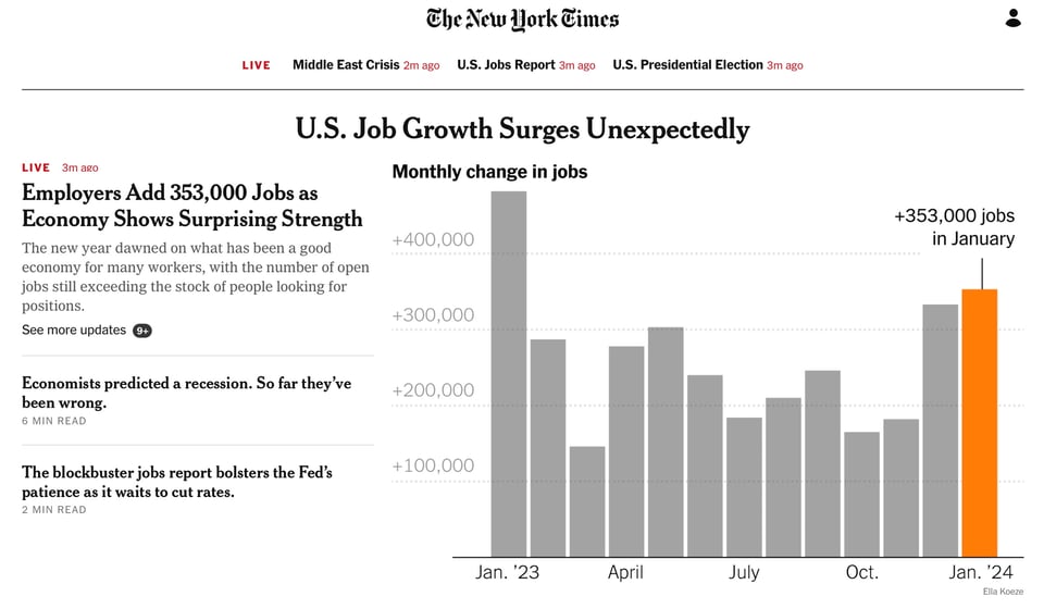 Further, “Unemployment held at 3.7%. Wages rose unexpectedly fast in January, too. Average hourly pay climbed a sharp 0.6% from December, the fastest monthly gain in nearly two years, and 4.5% from January 2023, “ the Associated Press reported yesterday morning.