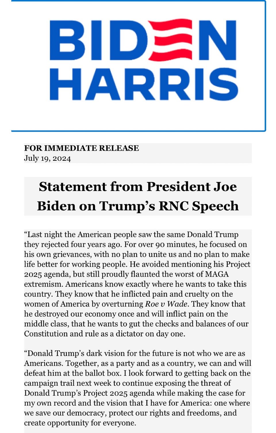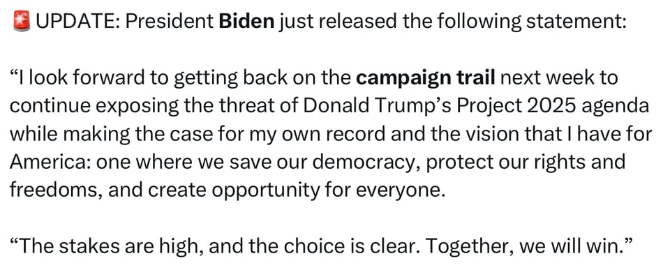 Senior Advisor to Biden Anita Dunn also confirmed Biden was not dropping out. (Seth Dworkin, The Dworkin Report, Substack).