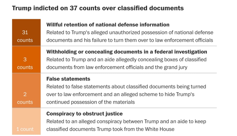 The 49-page indictment contains 37 counts and seven separate charges against Trump.