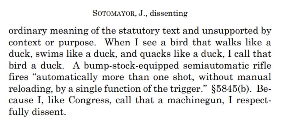 In a dissent joined by her liberal colleagues, Justice Sotomayor said that bump stocks fit under the ordinary meaning of the law: “When I see a bird that walks like a duck, swims like a duck, and quacks like a duck, I call that bird a duck,” she wrote. The ruling, she said, could hamstring the ATF and have “deadly consequences.”