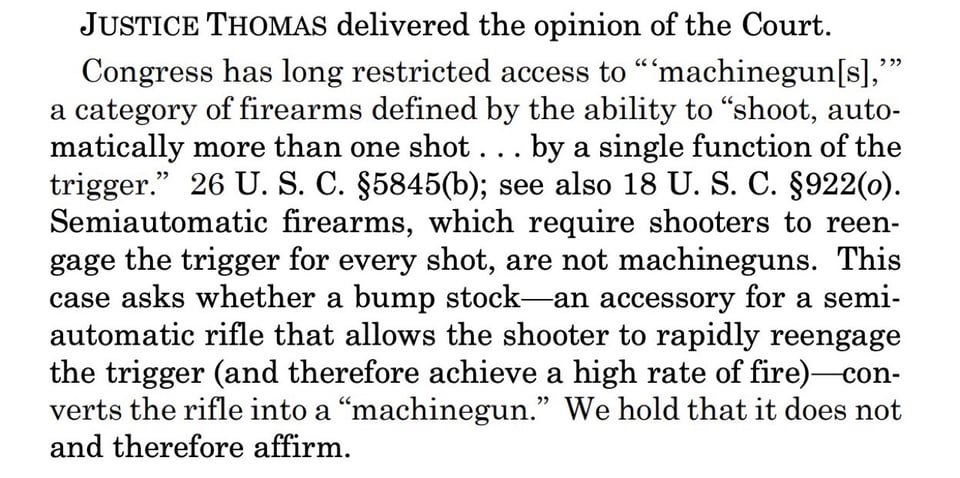 The 6-3 majority opinion written by Justice Clarence Thomas found the Justice Department was wrong to declare that bump stocks transformed semiautomatic rifles into illegal machine guns because, he wrote, each trigger depression in rapid succession still only releases one shot.